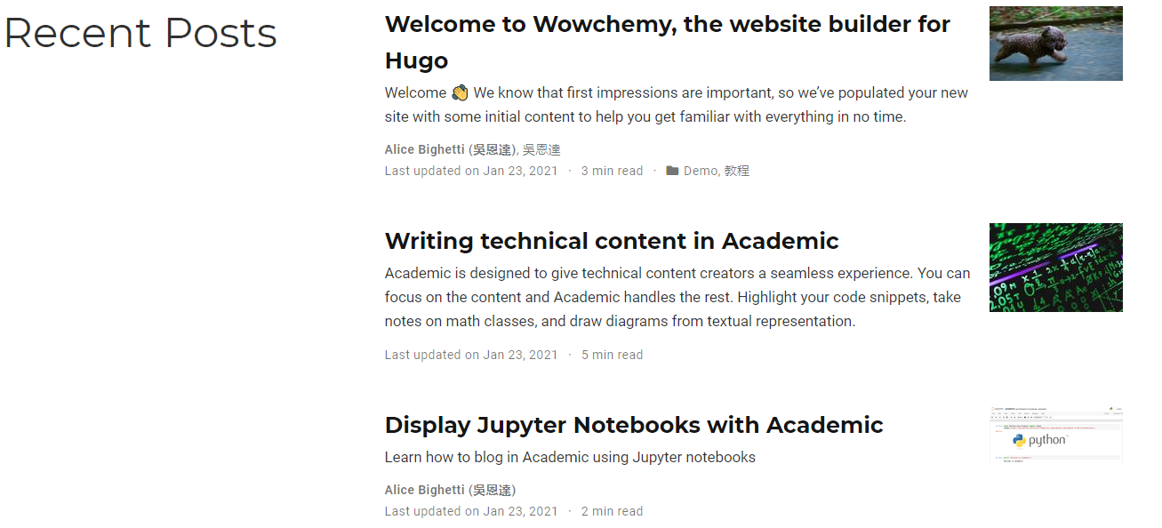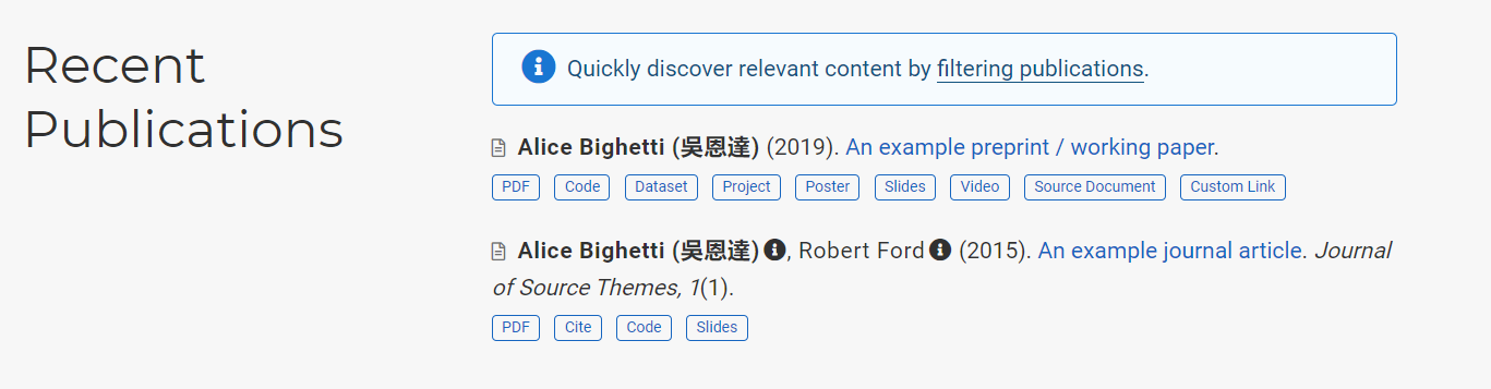 Hugo Widgets 最近用 google 搭建了一个个人主页,被里面的 widget 整迷糊了,记录一下 Content Feed (pages)¶ posts -> post post talks -> event talk project slide publictions -> publication publication publication & event/talk & post & project¶ tag 关联 project 关联