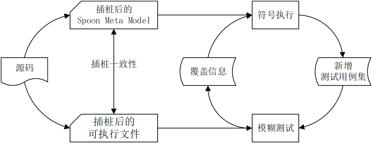 - 使用 Spoon 对 Java 程序分析插桩后生成 Spoon Meta Model,然后使用 prettyprint() 将其打印到磁盘上,转化为 Java 代码。再对新的 Java 代码做符号执行和编译为可执行文件,这样可以保证“插桩一致性”以及不受符号执行工具的制约。